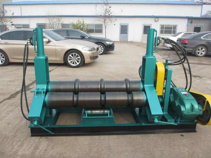 該機(jī)結(jié)構(gòu)形式為三輥非對(duì)稱式。側(cè)輥在兩直列輥中間對(duì)稱位置作平衡升降運(yùn)動(dòng),通過(guò)絲杠、絲母而獲得,兩直列輥?zhàn)餍D(zhuǎn)夾緊送料運(yùn)動(dòng),通過(guò)減速機(jī)的輸出齒輪與下輥齒輪嚙合,實(shí)現(xiàn)板材的行走。當(dāng)側(cè)輥輥的下壓力超過(guò)材料的屈服限度時(shí),便使所卷制的材料變形,從而達(dá)到卷制直徑達(dá)大?。?br /> 三、技術(shù)參數(shù)